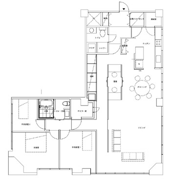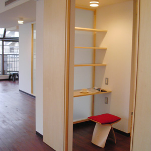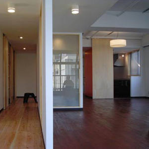 日本に長期滞在する外国人のための賃貸物件として全面的に改装しました。昔の品質の良い材料の床を保存し、壁や天井を取り除きました。廊下とダイニングの境に小さな書斎とそれににつながる壁を設け、ゆるやかに部屋全体をつなげています。夜にはこの書斎に電気が灯り、あんどんのように部屋全体を明るくします。なによりも奥行きが深いこの住宅では長いリビングにゆったりと家具を配置し、寝室などの個室はL字の奥へ機能的に配置しました。キッチンからゆるりとつながるリビングは大きな角となり、生活を機能的に分ける角になりました。(collaboration with ADKJapan real estate)