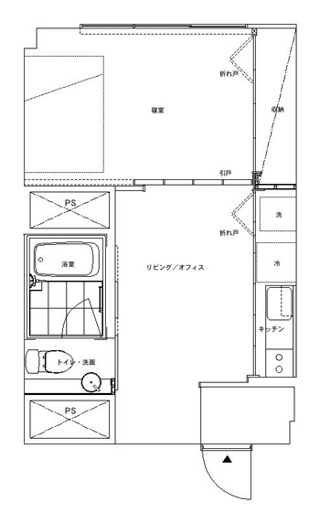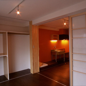 元麻布という場所柄、ワンルームマンションとしてだけではなく、SOHOとしての賃貸利用を踏まえての改装となりました。住居として、仕事場として、違う顔を持つように家具のような可動壁のようなからくり仕切りを提案しました。開放的にキッチン前の扉を開ければダイニングキッチンとなる場所も扉を閉めればキッチンもその姿を消し、一変オフィス仕様に様変わりします。窓側の続き間との仕切りは半透明の素材を使った壁のような引き戸としました。大きな扉なため、厚みが必要になります。その厚みを利用して、扉前面に針金を通しただけのマガジンラックにしました。自由に部屋を組み立てていくような感覚で色々な使い方がされるような仕掛けを考えました。