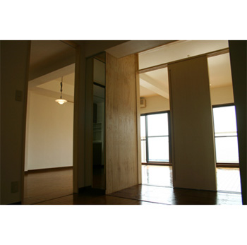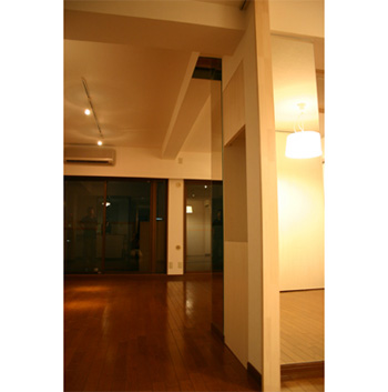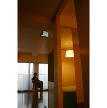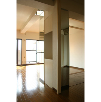 住み手は女性一人です。リビングと寝室の間に押し入れがあり、寝室には全く日光が届かなく、暗い部屋でした。そこで押し入れの壁をなくして3枚の引き戸でリビングとの仕切りをつくり、さらに引き戸の上部に明かり取りの窓を設けました。ここから差し込む朝の光で気持ちよく目覚めることができるそうです。オープンな寝室は普段は開放して広いリビングとして使うことができます。また、梁下と壁の一部に鏡を張り、さらに室内に光を入れ、部屋の境界線を曖昧にしています。