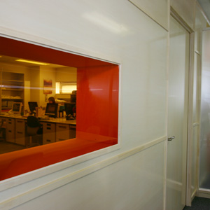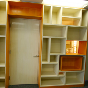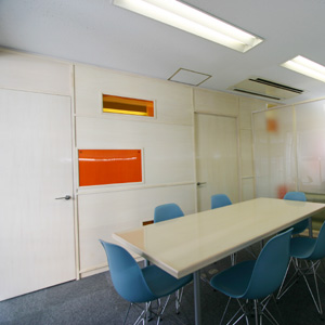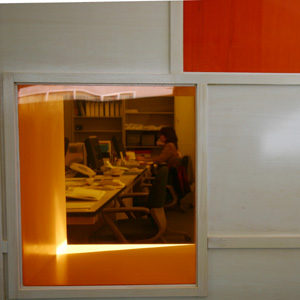 従業員数は5人の事務所です。ワンルームの執務空間と、会議室がひとつ、休憩室がひとつという構成です。執務空間と個室との間仕切りを積層した壁に見立て、色の付いている箱は自由に取り出すことができます。また、箱の背の一部は色付きアクリルの板になっており、お互いの部屋の様子を伺うことができます。ただの間仕切り壁をつくるのではなく、壁でもあり棚でもある仕切りを計画しました。