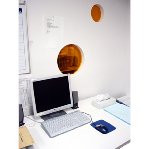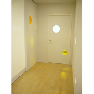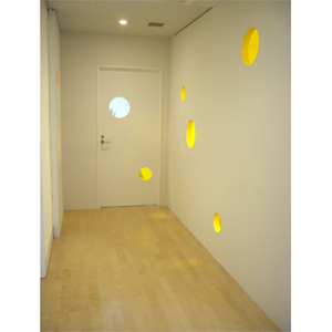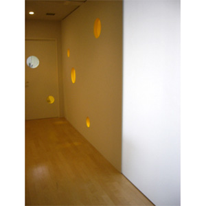閉鎖的なオフィスの壁にランダムに丸い窓を設け、廊下の気配を感じるような楽しい仕掛けを作りました。廊下側からも、事務室側からも楽しい景色に変化しました。