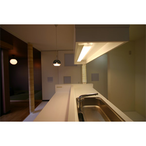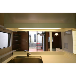元々は夫婦と子供3人の暮らす住宅でしたが、時間の経過により、近い将来に夫婦ふたりだけの暮らしになることに備え、キッチン、リビングダイニング、和室、廊下、と細かく分化されていた1階部分を、ゆるやかにつながる一つの空間にしました。L字で囲う庭の部分にはデッキとベンチを新設。床の高さと合わせているので天気の良い日にはデッキ部分も部屋の一部になります。和菓子を作るのがご趣味の奥様のために、キッチンの範囲を広げ、キッチンカウンターをリビングに向けました。